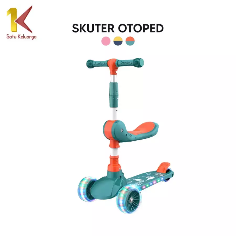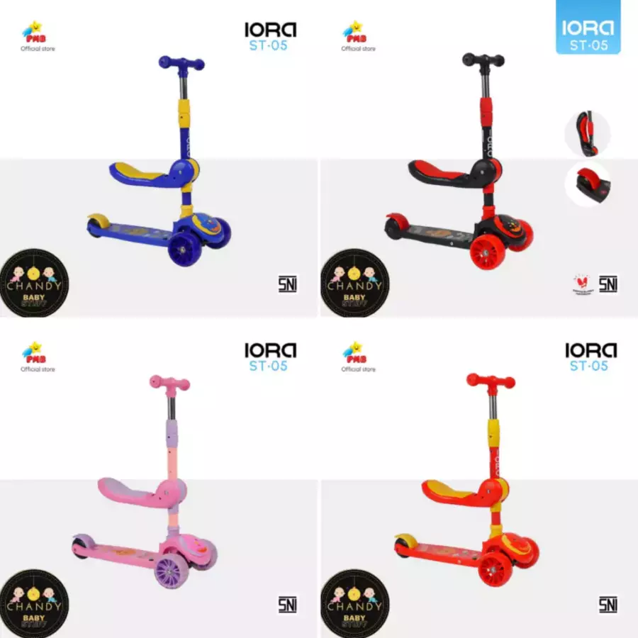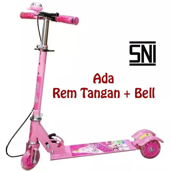Produk skuter anak roda tiga yang satu ini sangat affordable dengan fitur yang menarik untuk anak-anak seperti bel dan lampu roda yang menyala. Di bagian papan ada stiker dengan karakter seperti Hello Kitty, Frozen, Spiderman, atau Avengers, dan tiang stang bisa dinaik turunkan hingga ketinggian 80 cm. Skuter ini juga bisa dilipat jadi mudah dibawa ke manapun Moms pergi.