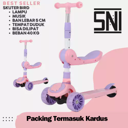 Skuter anak roda tiga Type Bird juga punya fitur yang cukup lengkap. Ada tempat duduk, roda yang menyala, dan juga musik. Papannya bisa menahan berat badan hingga 60 kg, untuk bangku 40 kg. Keamanannya juga terjamin dengan fitur rem belakang, jadi Si Kecil tinggal menginjak papan bagian belakang. Skuter ini juga mudah dibawa ke mana-mana karena dapat dilipat.