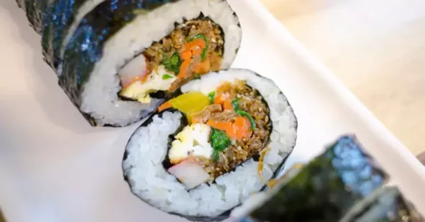 Tempelkan nasi pada nori ke seluruh bagian, taruh timun, wortel, telur dadar, dan beef slice yang sudah dimasak secara berurutan. Gulung dengan tangan, lalu potong dengan pisau tajam. Sajikan dengan soyu (kecap asin Jepang).
