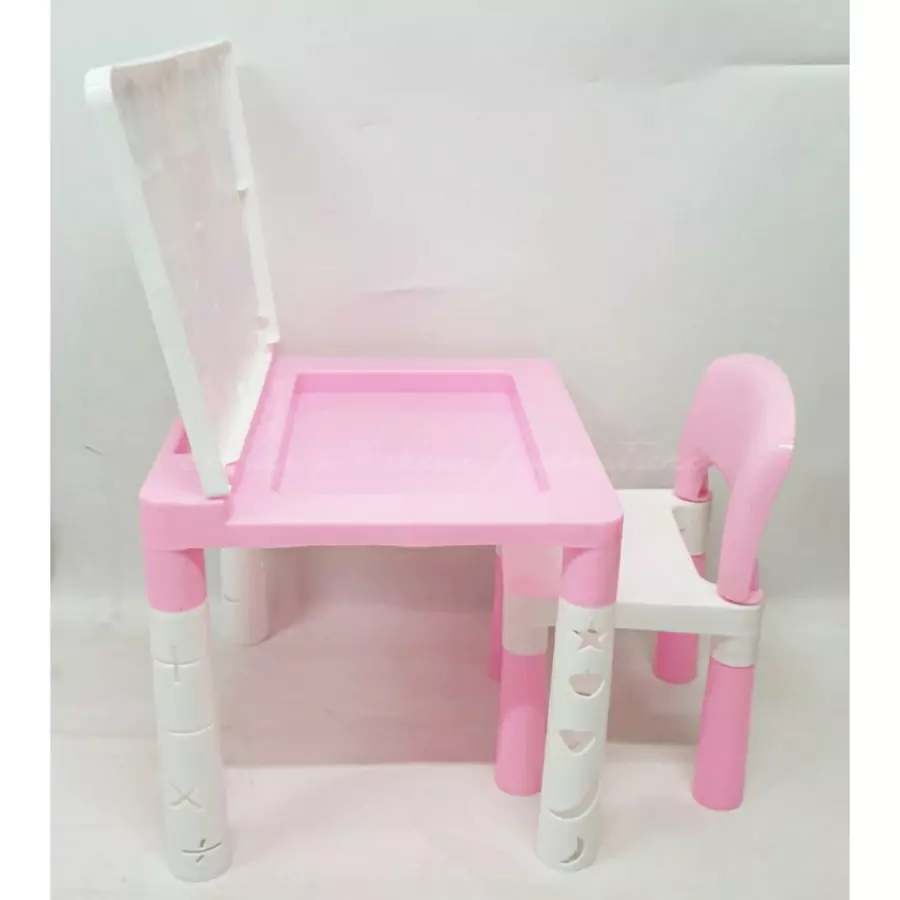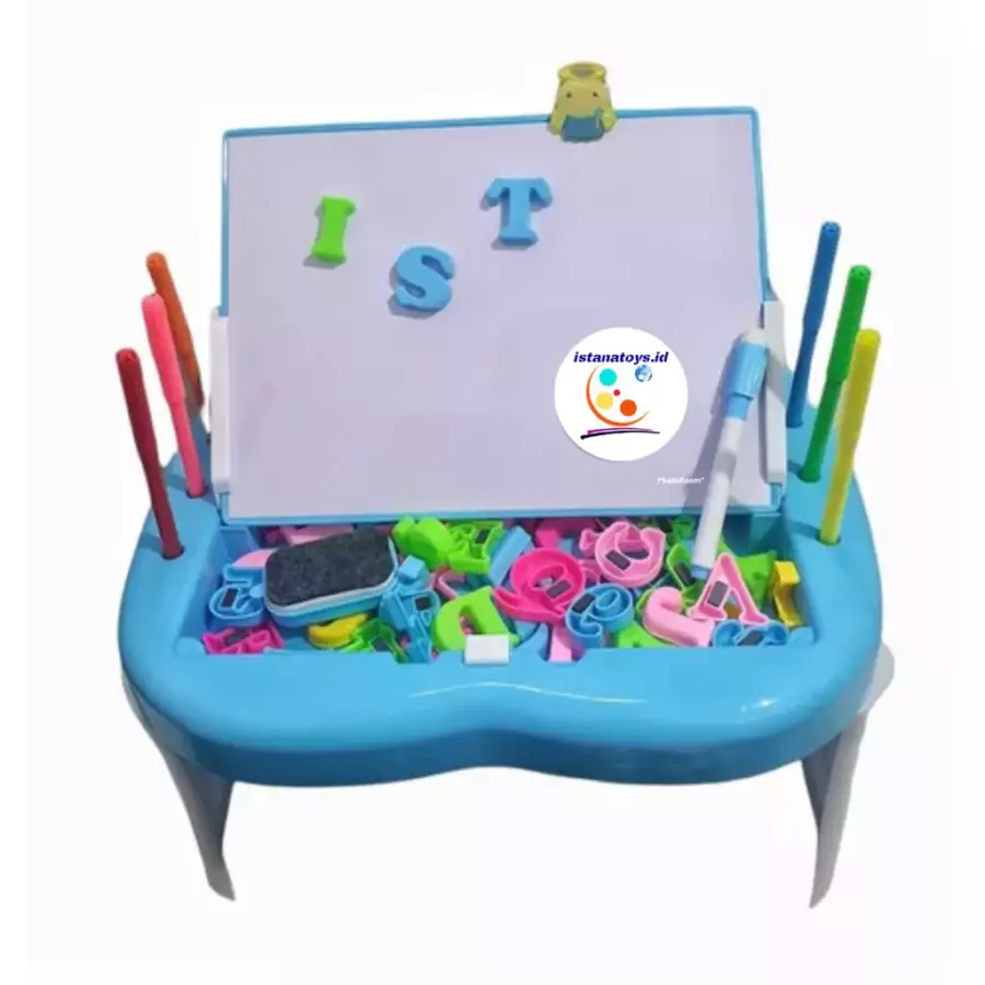 Meja belajar anak satu ini cocok untuk usia dini beraktivitas mengenal huruf dan angka. Karena mejanya bisa digeser menjadi papan tulis dan ditempel magnet angka yang sudah termasuk ketika membeli produk ini. Meja ini juga tidak dijual satu set dengan kursi, karena itu sebaiknya Moms mencarikan kursi yang cocok dengan ukuran meja belajar ini.