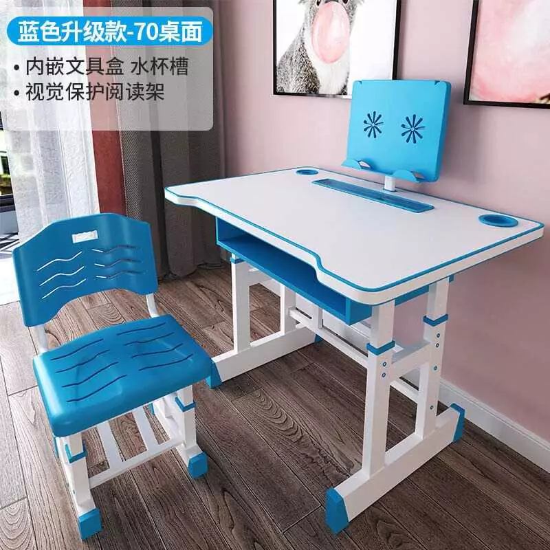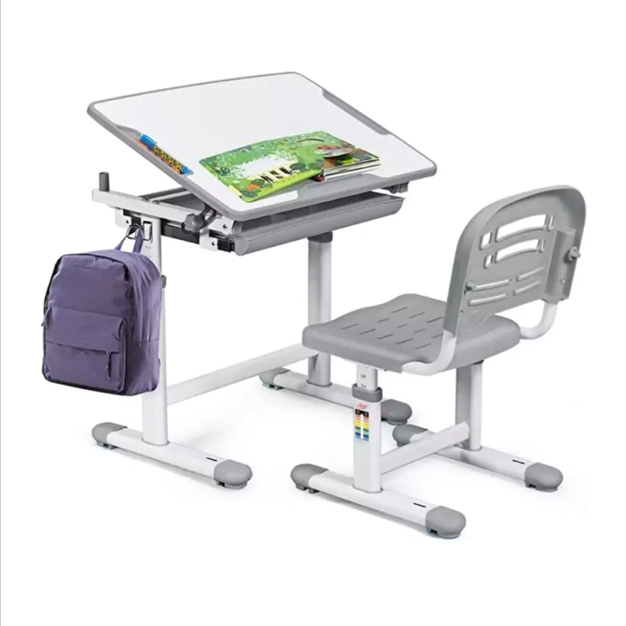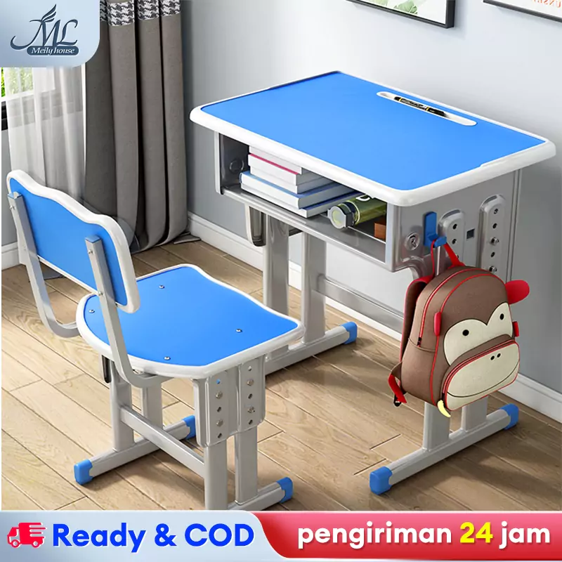 Set meja belajar anak dan kursinya desainnya simpel dan biasa dipakai di sekolah anak. Meja dan kursinya bisa diatur sesuai dengan tinggi badan anak, salah satu produk yang ergonomis. Selain itu, tersedia beberapa pilihan warna seperti putih dan pink dengan pengait untuk tas di samping meja.