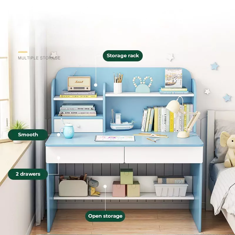 Meja belajar satu ini juga punya desain minimalis tapi dengan warna yang cocok dengan anak. Ukurannya besar dengan dimensi 120 x 55 x 120 cm dan punya dua laci di bawah meja juga rak penyimpanan.