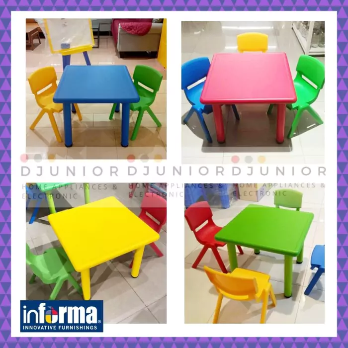Meja belajar anak satu ini punya desain simpel untuk berbagai aktivitas seperti bermain di dalam maupun di luar ruangan. Ukurannya 60 x 60 x 52 cm berbentuk persegi, varian warnanya juga banyak seperti merah, biru, hijau, kuning yang cocok untuk anak.